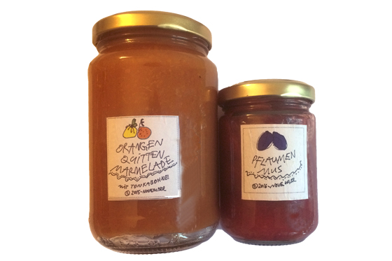 Marmeladengläser mit dsignten Etiketten für Orangen-Quitten-Marmelade und Pflaumenmus